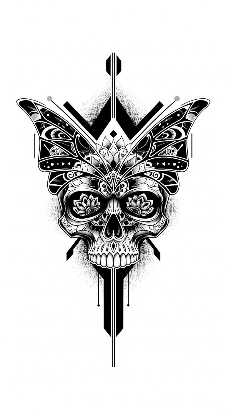 Placed along the upper forearm, shoulder blade, or chest, this design pairs delicate, wing-like filigree with a subtly integrated skull silhouette, using negative space and fine dotwork to balance fragility and grit. Symbolically it marries metamorphosis and mortality—wings for liberation, the skull for remembrance—evoking bittersweet acceptance and the exhilaration of change. Emotionally it reads as both tender and defiant, suitable for someone honoring personal rebirth; size and curvature should follow musculature so the composition moves with the body and feels intimate yet striking.
