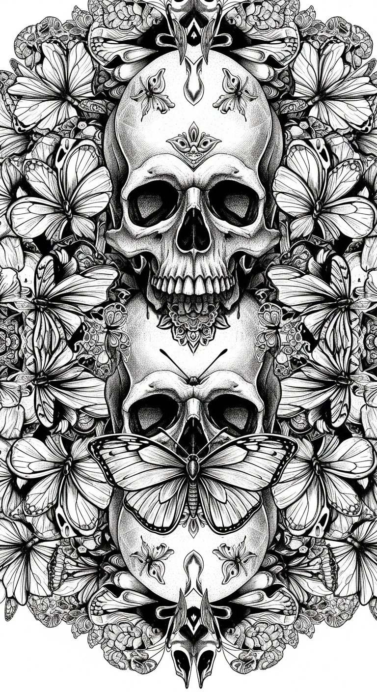 This design symbolizes the coexistence of mortality and rebirth: the skull grounds the piece in acceptance of impermanence, while the butterfly wings introduce hope, transformation, and liberation.