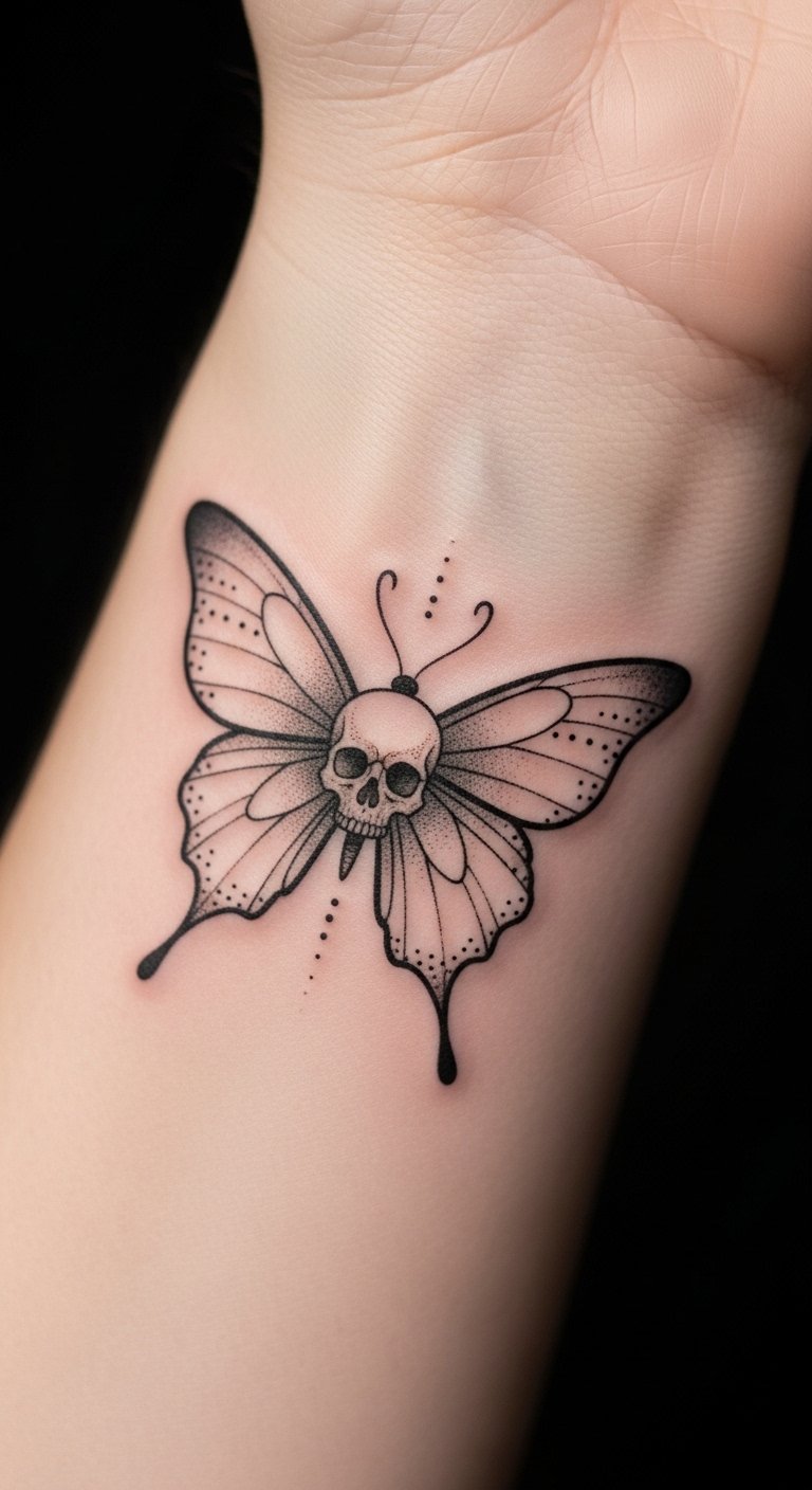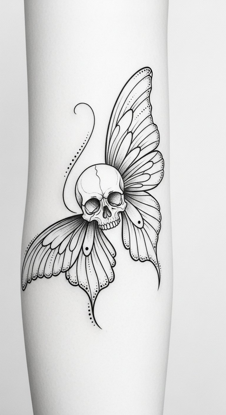 The design symbolizes transformation and mortality—wings of rebirth framing a small skull to acknowledge endings as part of renewal—evoking bittersweet tenderness and quiet strength; it feels intimate and contemplative, suited to placements like the inner forearm, ribcage, behind the ear, or collarbone where its fine details can be appreciated up close and carried as a personal reminder.