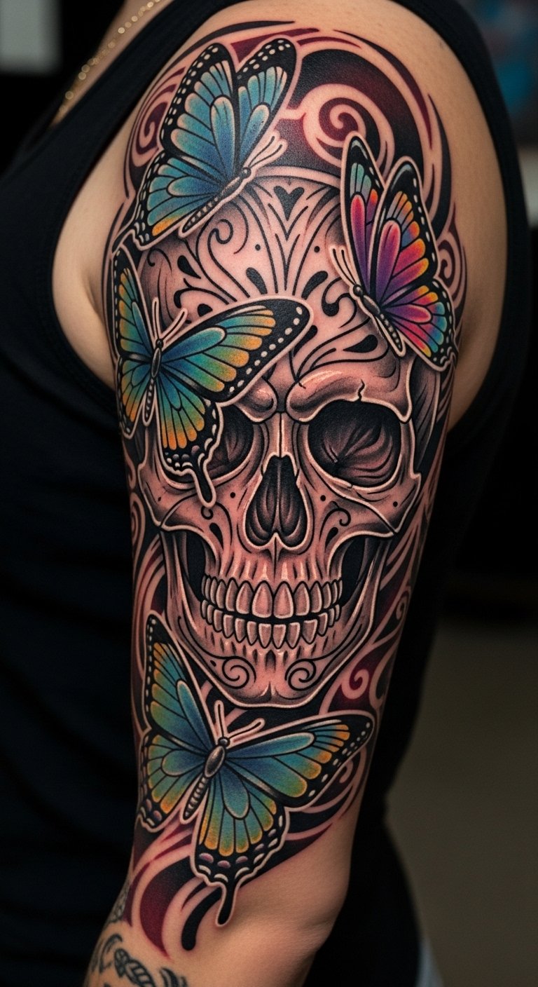 If you seek a tattoo that fuses bold imagery with rich symbolism, the neo-traditional butterfly skull tattoo might be the perfect choice.