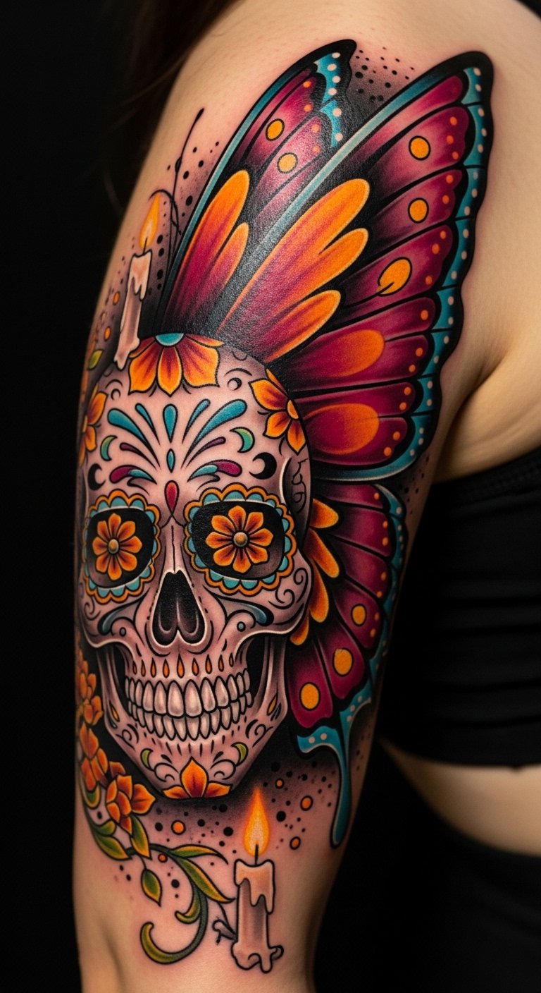 Embracing the vibrant spirit of the Day of the Dead, a butterfly skull tattoo bursts with color and symbolism, celebrating life, death, and the connection between them.