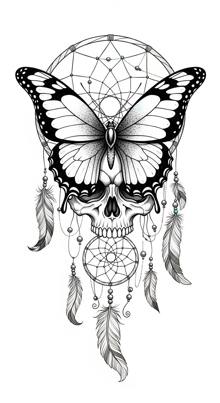 Merging the enchanting elements of a butterfly skull with the mystical allure of a dreamcatcher can create a striking tattoo design that captures both beauty and protection.