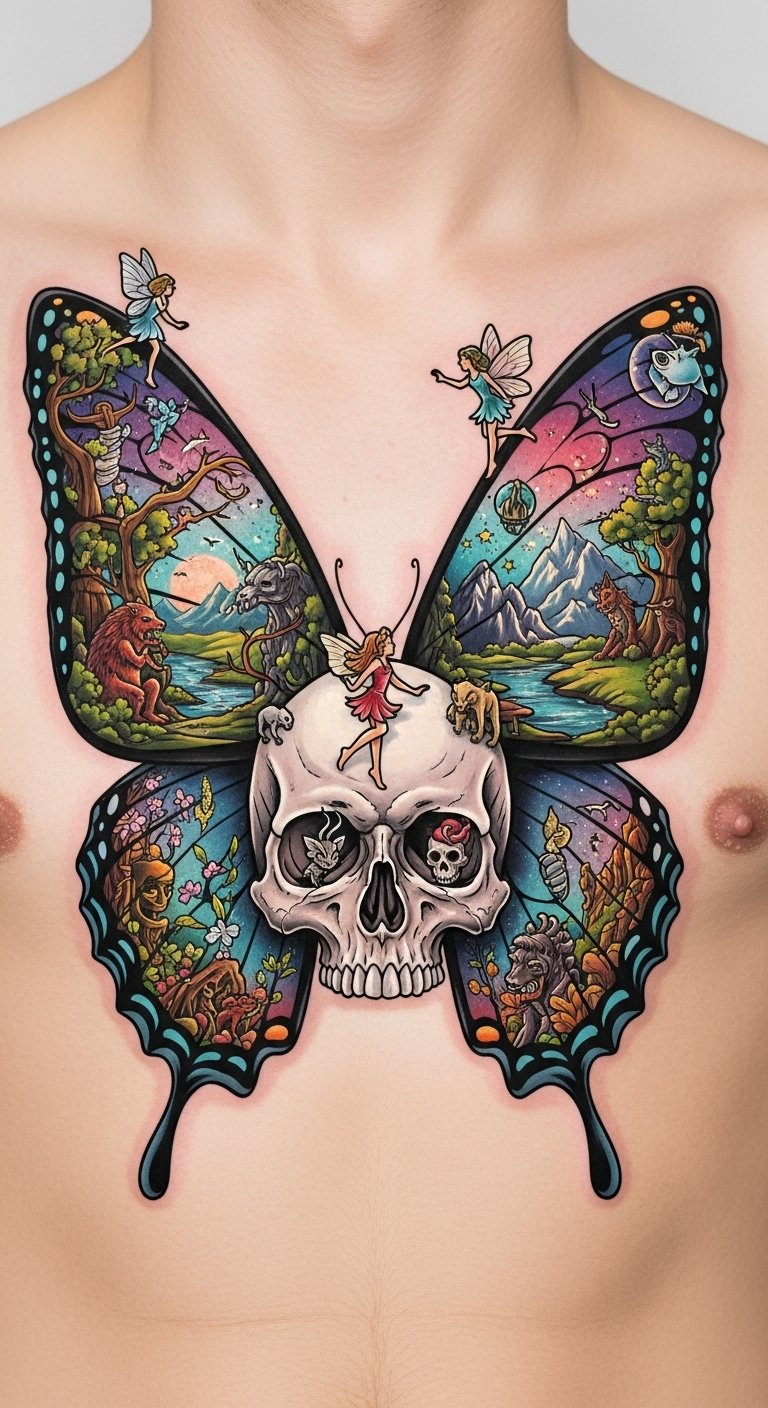 This concept pairs vibrant, iridescent butterfly wings with a delicately detailed skull at the center, surrounded by tiny fairies, mythical beasts, and miniature surreal landscapes that spill from the eye sockets; colors should be bold and whimsical—teal, magenta, gold—accented with soft shading and dotwork for a dreamlike glow.