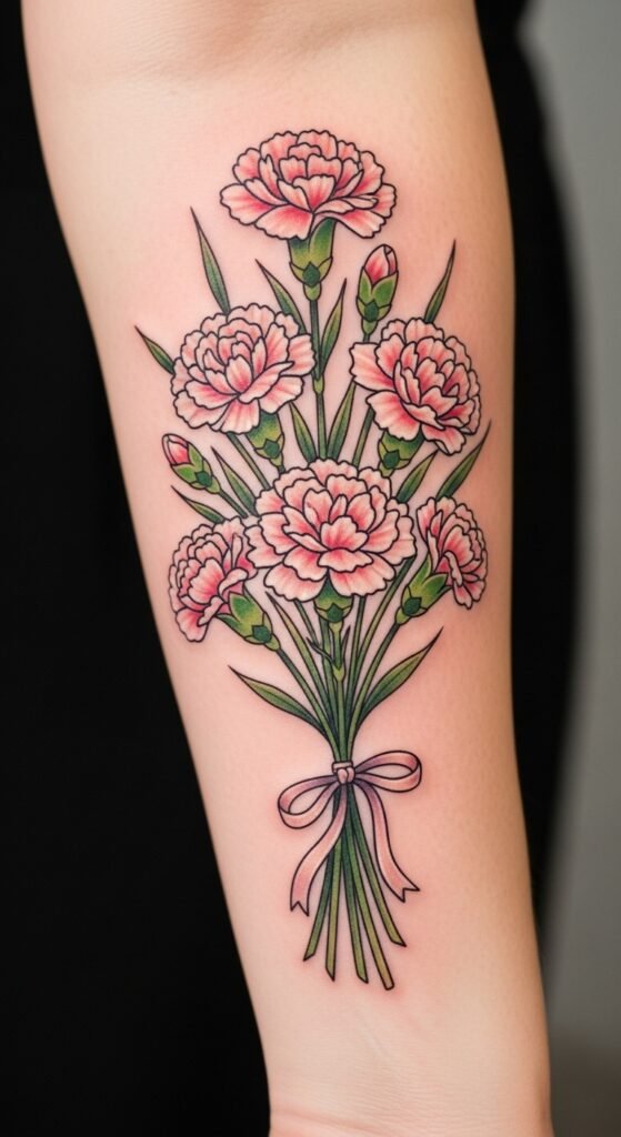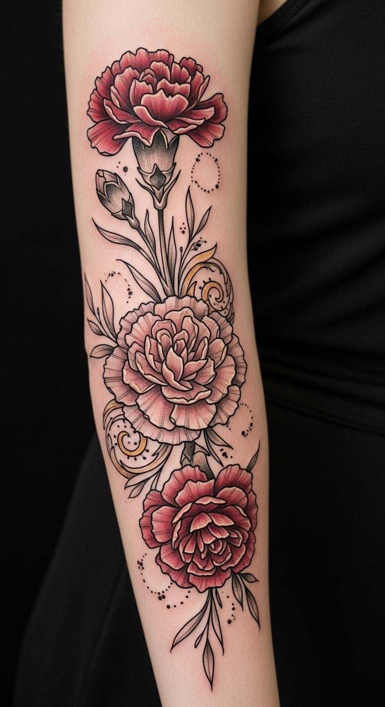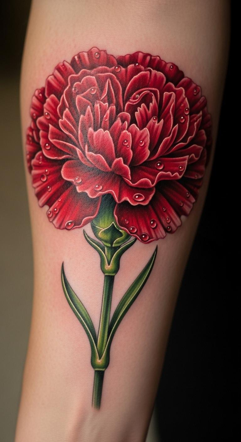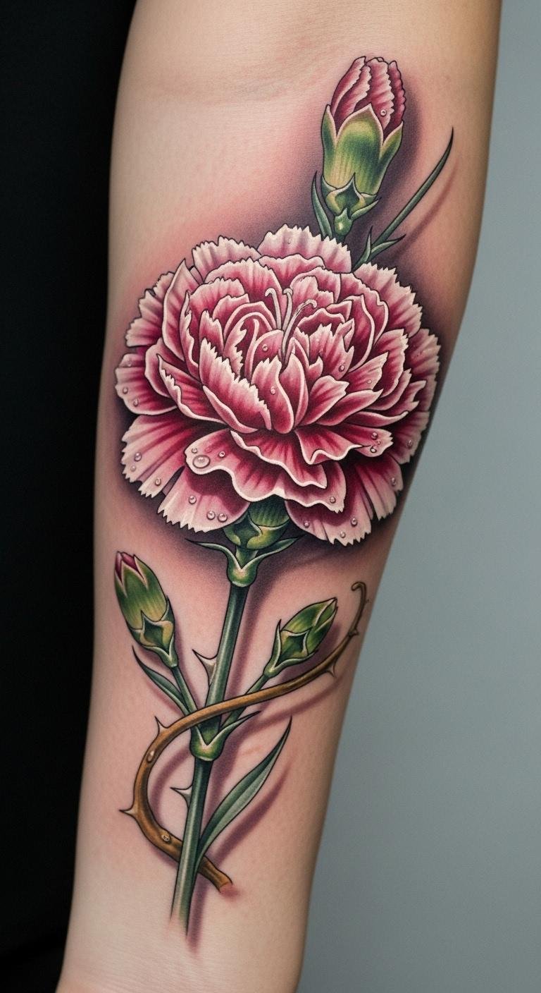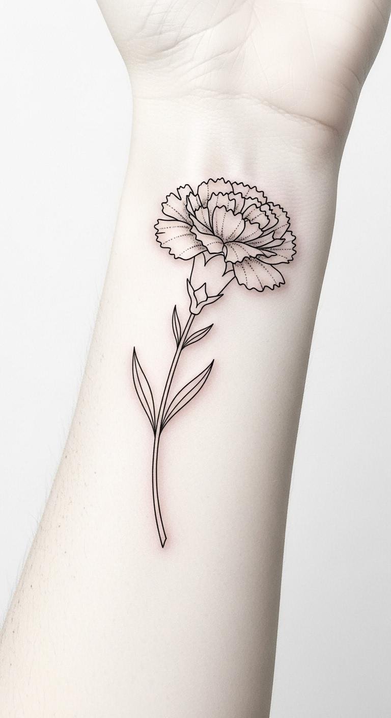 Placement along the forearm allows the carnation’s natural curve to complement musculature and movement, symbolizing enduring affection and personal growth; choose soft pinks for gentle admiration or deep crimson for passionate devotion.