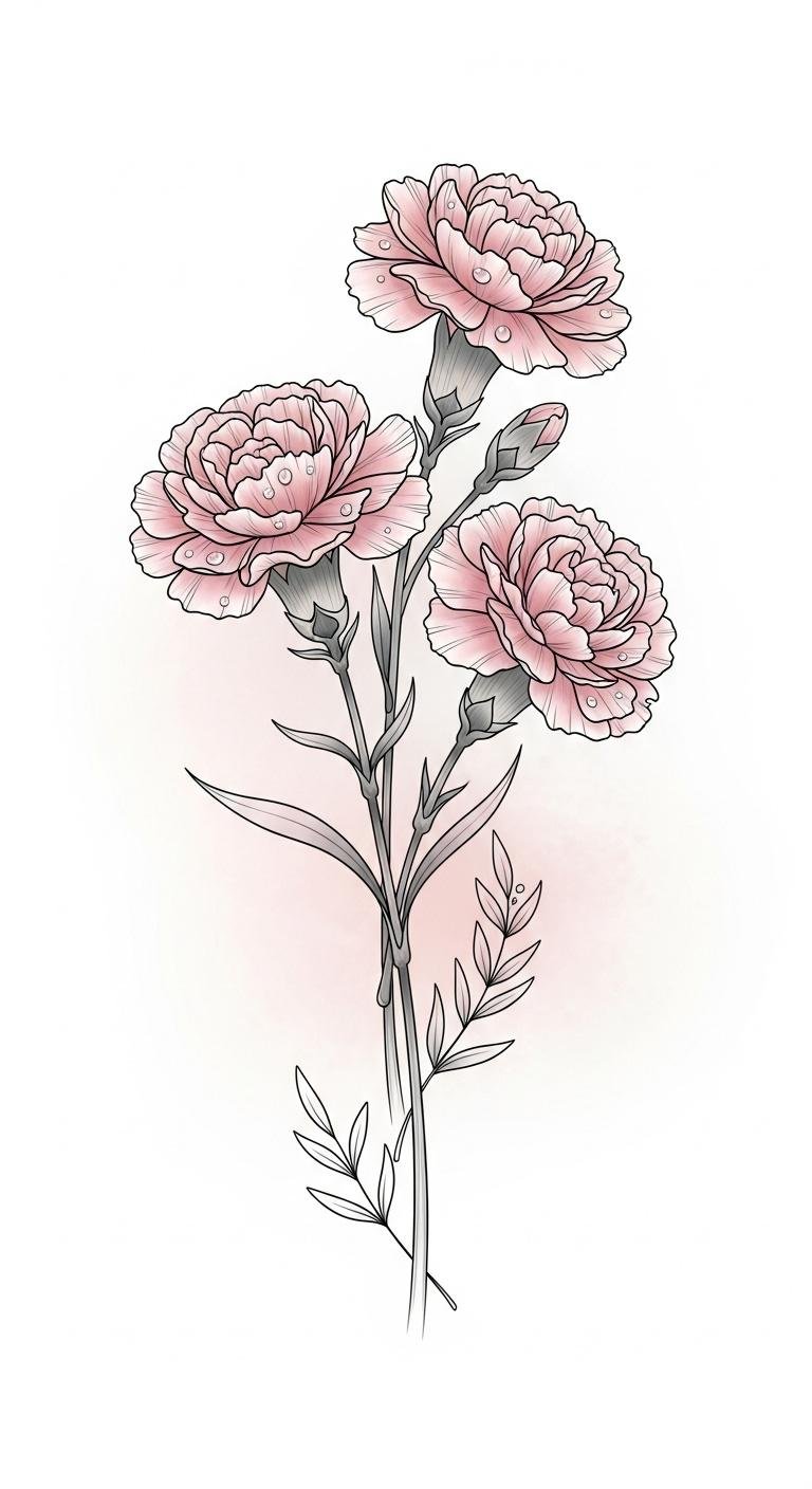 A delicate carnation tattoo inspired by the collaborative process: a single blooming carnation rendered in fine-line detail with soft shading and subtle dotwork, accompanied by a faint, watercolor wash in muted pinks and sage greens to evoke careful curation and thoughtful consultation. Symbolically it represents trust, communication, and the journey of finding the right creative partner; emotionally it feels reassuring and confident rather than bold or flashy. Ideal placements include the inner forearm, behind the ear, or on the ribcage where the design can be both visible for sharing and easily shown to an artist during consultation, allowing for adjustments in scale and style to match the artist’s specialties and hygiene-focused approach.