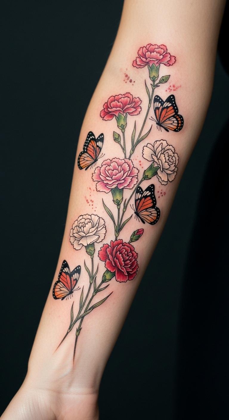 The vibrant colors of various carnation styles beautifully contrast with the delicate grace of butterflies, representing growth and freedom. Each butterfly’s flight echoes the depth of butterfly symbolism, making this pairing a powerful statement of love and personal evolution on your skin.