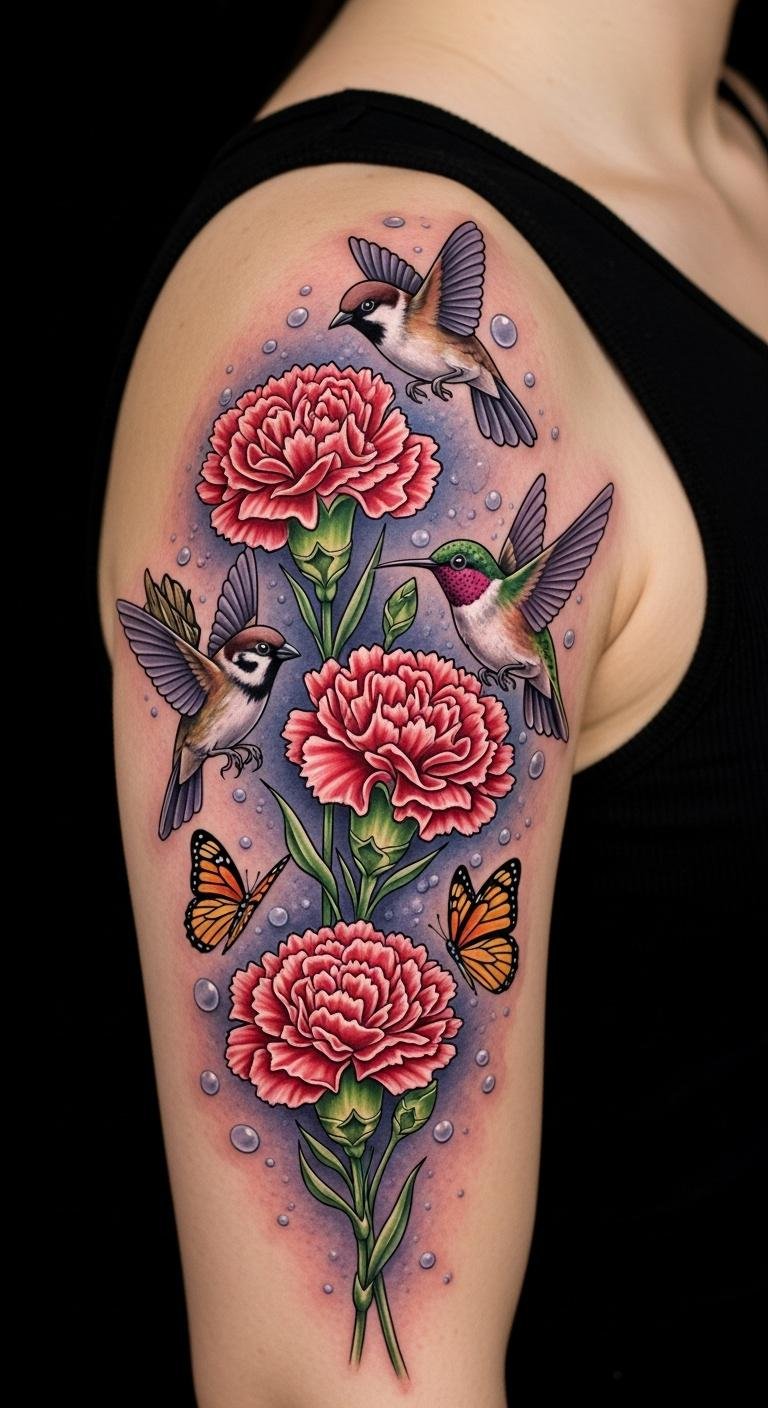 Birds woven among carnations and butterflies create a design that symbolizes liberation, renewal, and delicate strength; sparrows lend quiet resilience while hummingbirds add vibrant joy and energy, evoking uplifted emotion and movement.