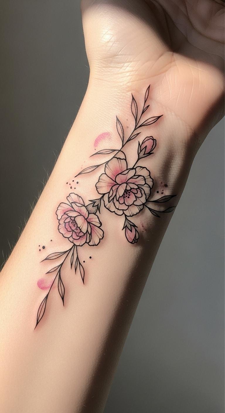 This placement emphasizes intimacy and visibility—close enough to touch, easy to conceal—and the carnations symbolize affection, admiration, and the layered complexity of feeling; fine lines and soft watercolor evoke tenderness and personal expression, making the tattoo both emotive and refined.
