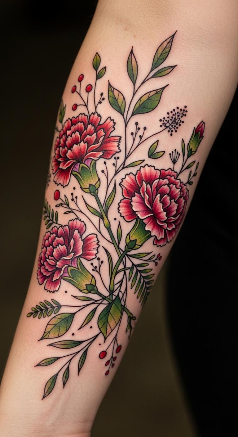 As you consider a forearm tattoo, envision the intricate details of carnations delicately interwoven with botanical elements that tell your unique story.