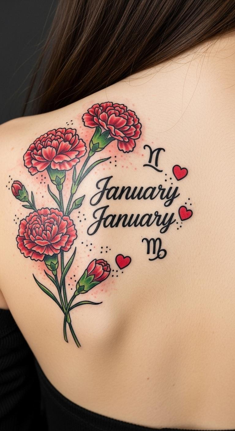 Shoulder and back placements emphasize intimacy and presence, the sweeping canvas allowing carnations to flow with the body’s contours; the design can layer vibrant petals with subtle shading to convey warmth, devotion, and the layered emotions tied to January birthdays.