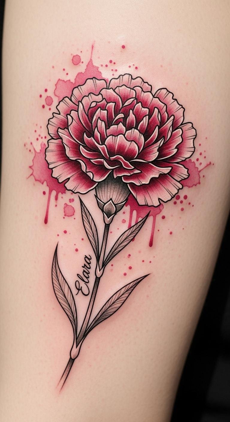 Symbolically, carnations represent love, admiration, and the endurance of familial bonds—qualities amplified when integrated with zodiac elements or personal traditions—so choose placement that reads both as a private memento when covered and a bold statement when revealed, allowing the tattoo to function as a wearable tribute and a celebration of heritage and emotion.