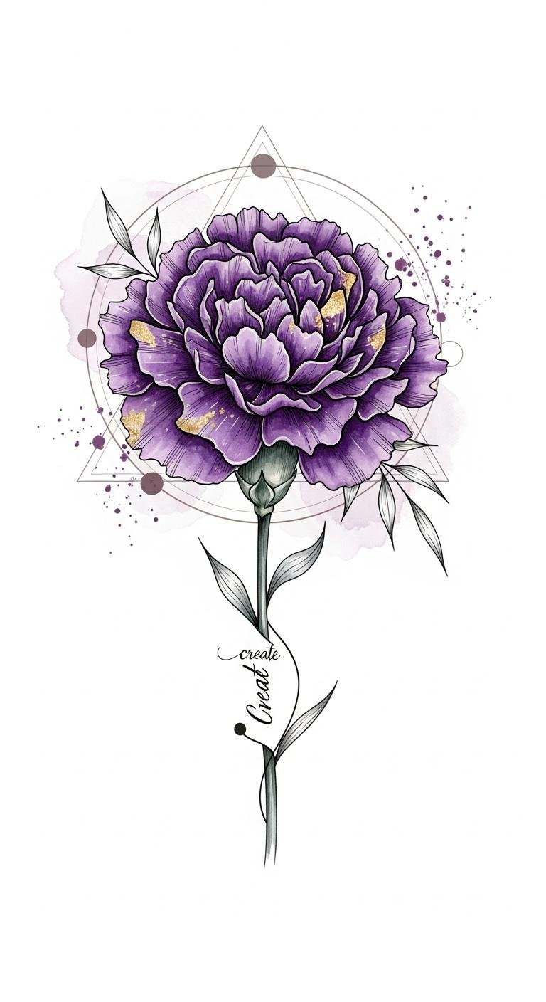With purple carnation meanings deeply rooted in celebration, it’s a perfect tribute to your unique journey. The design emphasizes creative energy through vivid violet hues and gold highlights, evoking admiration and distinction; emotionally it feels both celebratory and introspective, ideal for placements like the upper arm, shoulder blade, or along the ribcage where it can be shown or kept intimate.