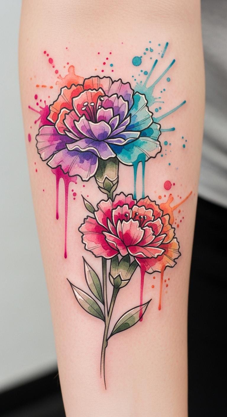 With a splash of color that dances across your skin, vibrant watercolor carnation tattoos transform the traditional floral motif into a breathtaking work of art. Utilizing vibrant techniques and mesmerizing color blending, these tattoos capture the essence of joy and freedom.