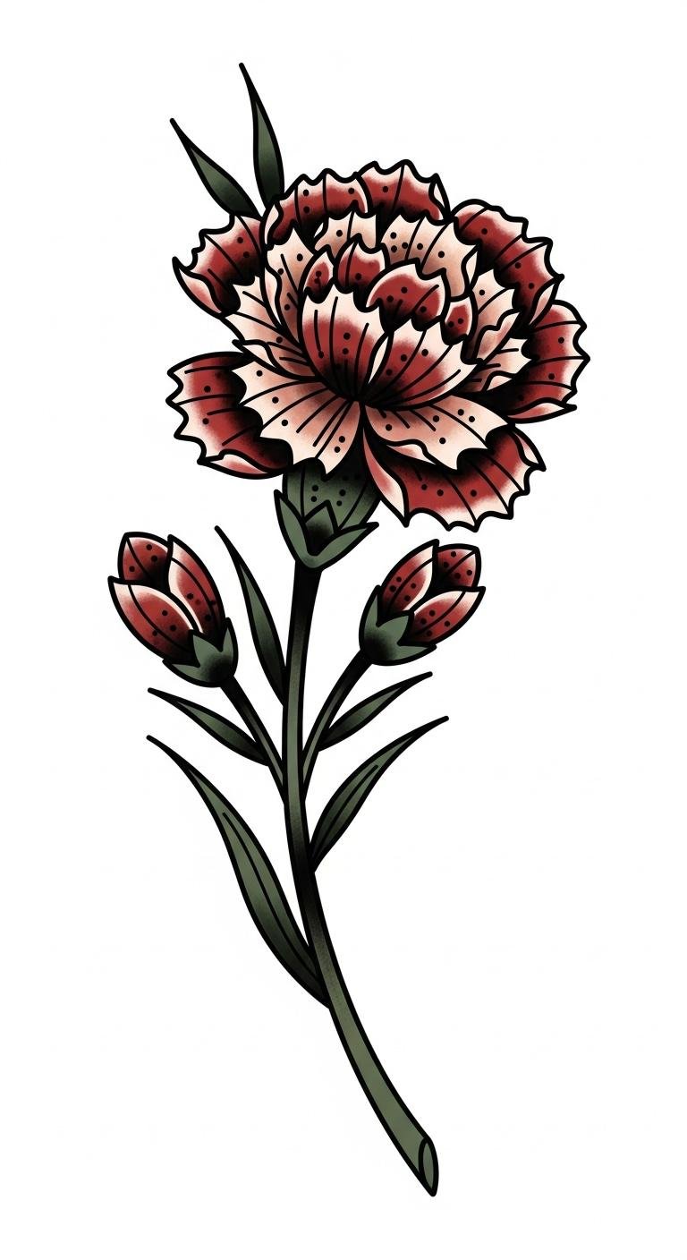 When it comes to tattoo styles, the choice between traditional and modern can dramatically influence the personality and story behind your carnation design. Traditional techniques embrace bold lines and classic palettes, evoking timeless beauty. In contrast, modern innovations introduce vibrant watercolor effects and intricate details, allowing your tattoo to stand out as a unique expression of your individuality. Choose the style that resonates with your spirit! This concept pairs a single carnation rendered with a split-style approach: one half in bold Americana lines and muted reds/greens to symbolize heritage, resilience, and enduring love; the other half in dripping watercolor hues and fine-line filigree to convey emotional vibrancy, transformation, and personal freedom. Ideal placements are the inner forearm or upper chest where the duality can face outward or inward—visible as a statement or close to the heart for intimate meaning.