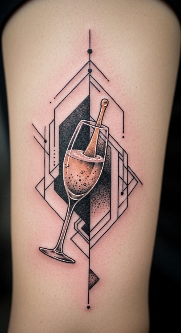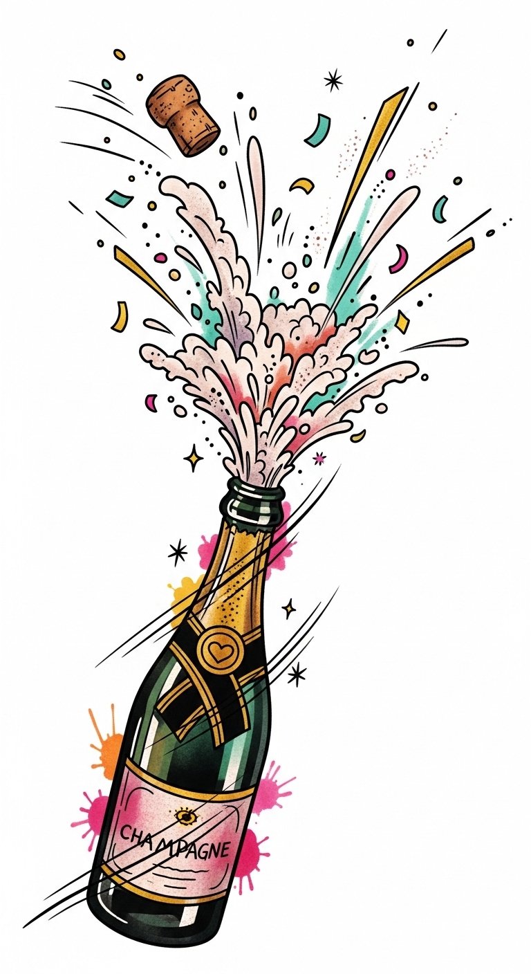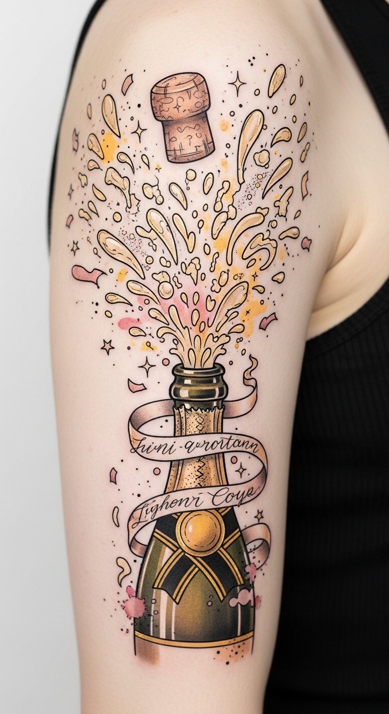 This festive tattoo bursts with vibrant colors and dynamic lines, embodying the spirit of a champagne celebration. It symbolizes not just the drink, but the thrill of life’s unexpected moments, reminding you to embrace every joyful explosion that comes your way.