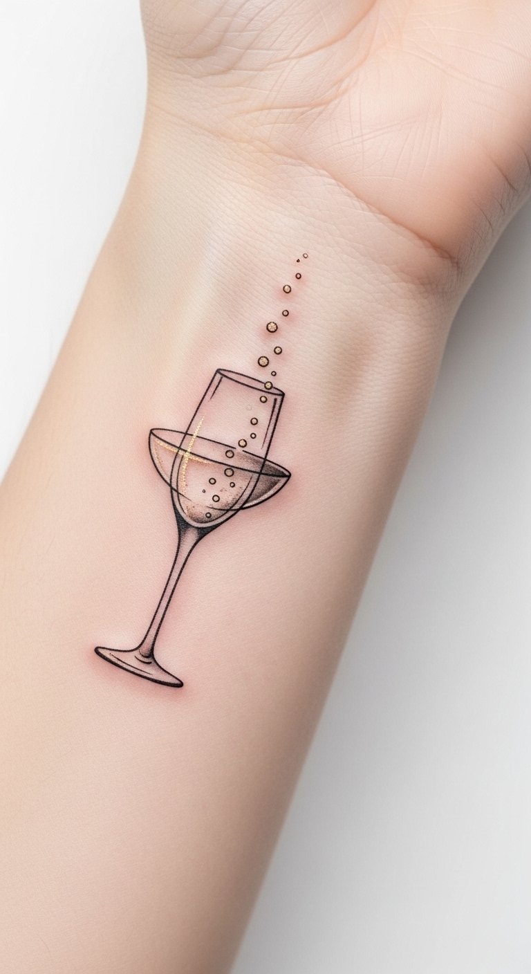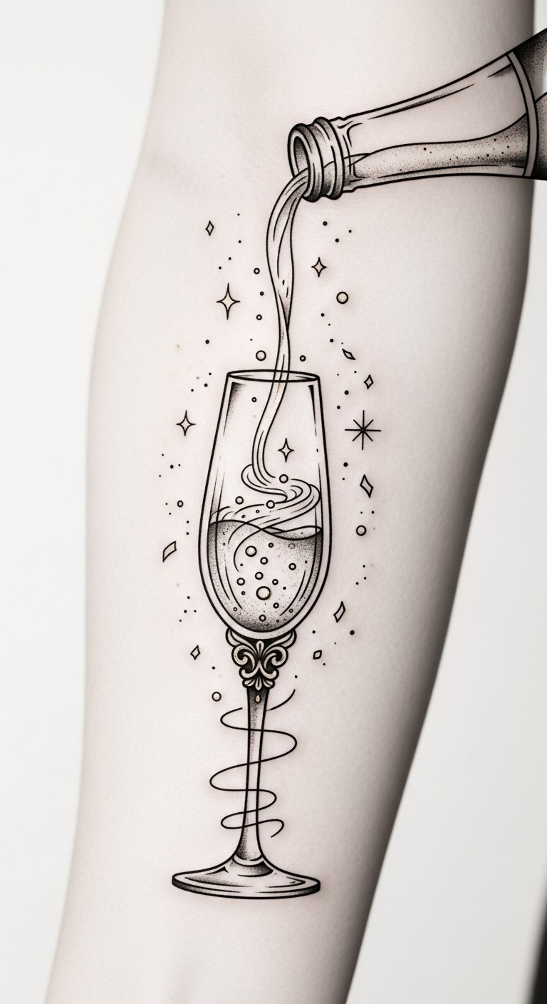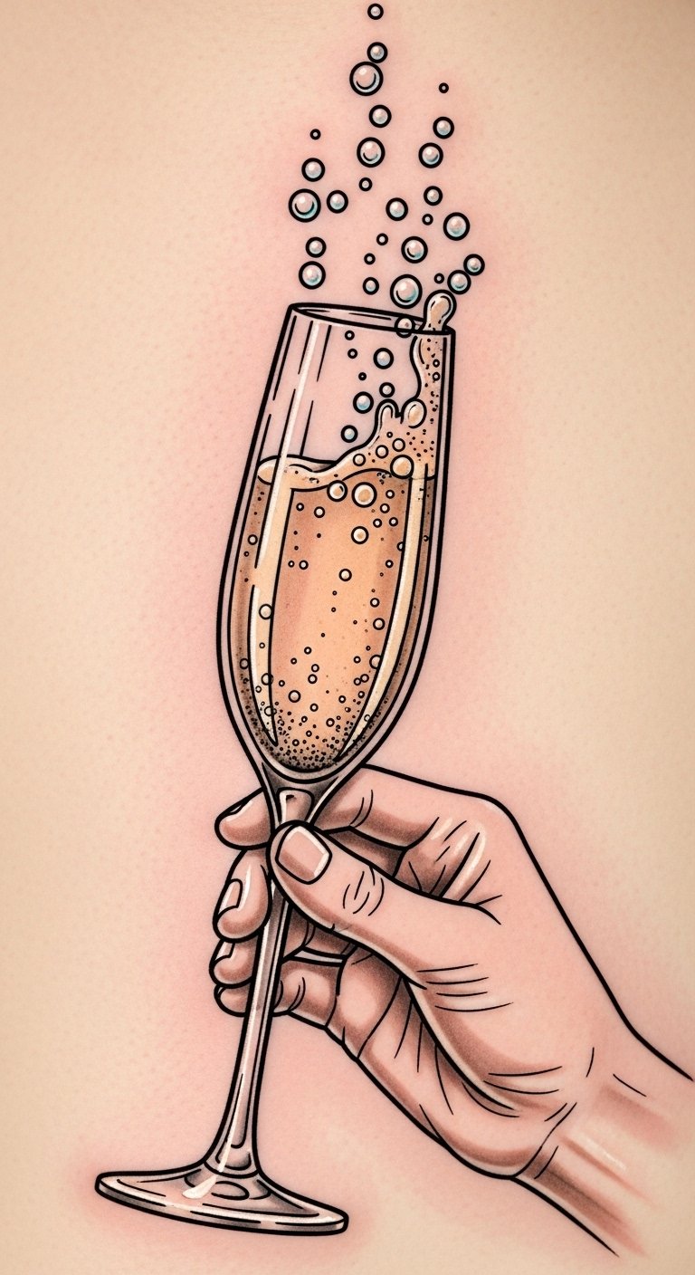 When placed along the forearm, wrist, or collarbone this design radiates uplifting energy and subtle elegance; the glass silhouette and rising bubbles symbolize celebration, personal victories, and the transient beauty of joyful moments, while delicate linework and soft highlights convey lightness and movement, making it ideal for someone who wants a reminder to savor life and express their free-spirited, festive nature.
