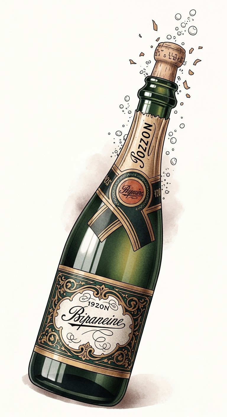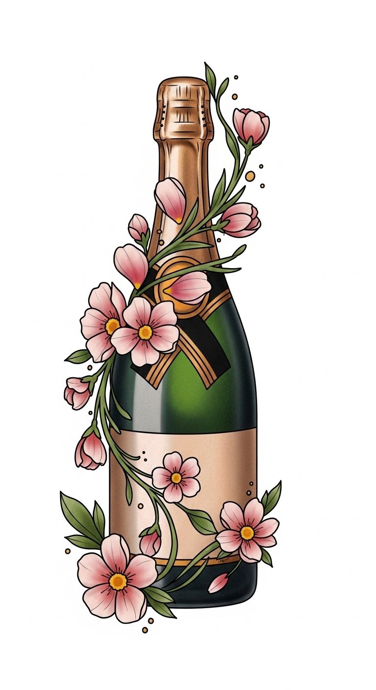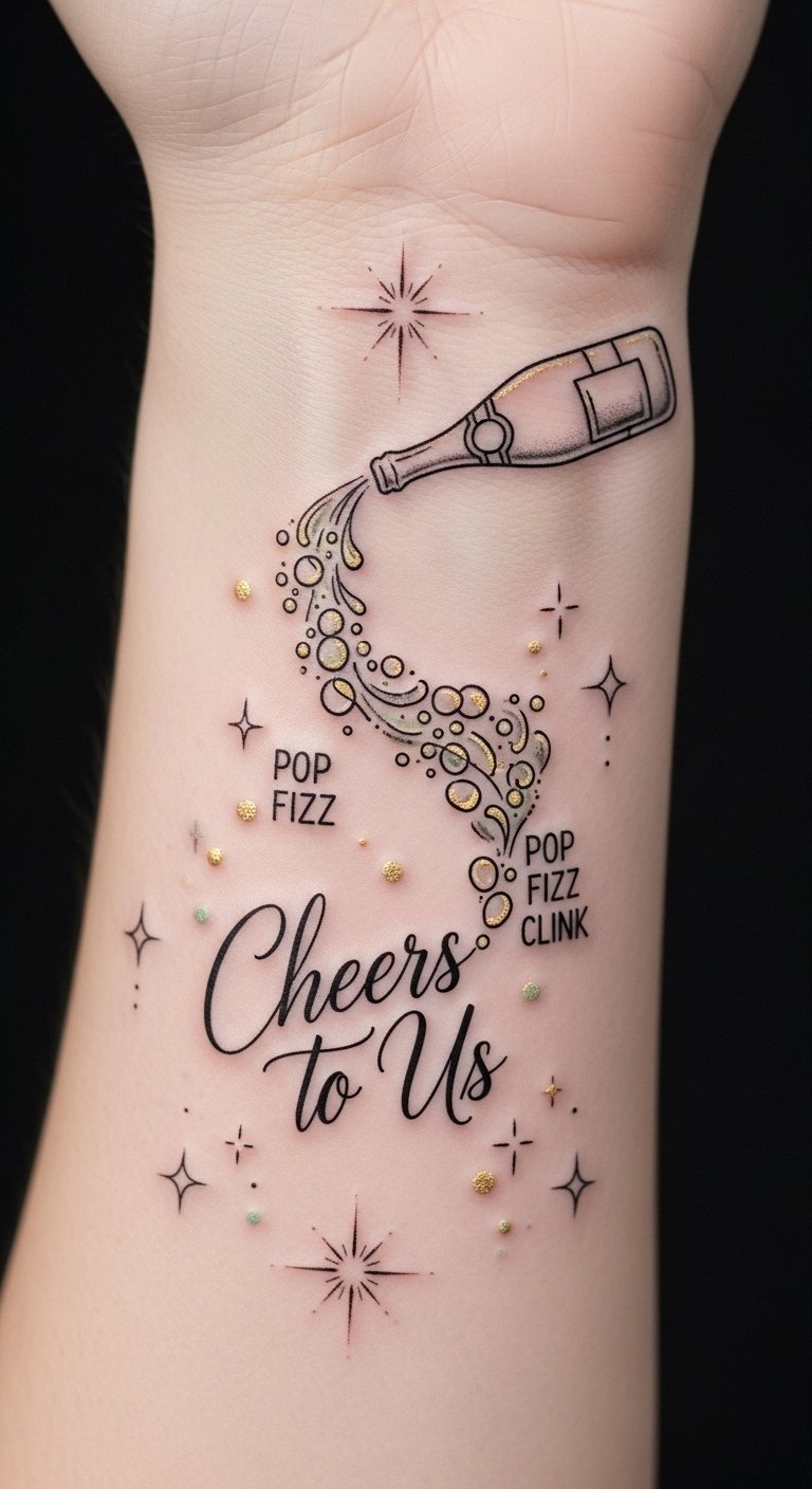 Each glance reminds you to embrace joy and revel in every occasion. The design evokes effervescence and lightness—bubbles as fleeting moments, the bottle as shared celebration—conveying warmth, nostalgia, and a playful confidence; ideal placements are the inner wrist, collarbone, or side rib for a personal yet visible reminder.