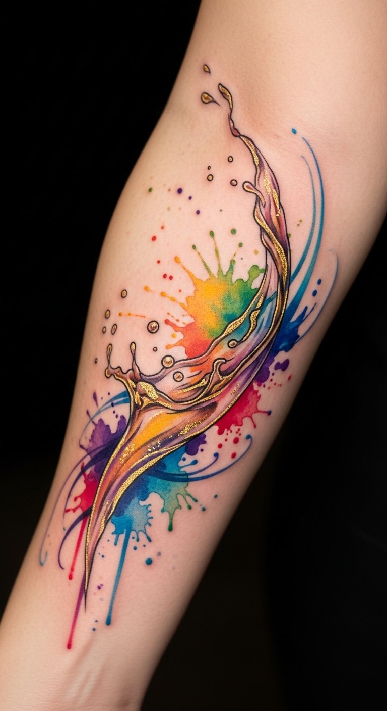 As you envision a watercolor champagne splash tattoo, vibrant colors burst forth like a celebration itself, bringing to life the exhilarating joy of special moments.