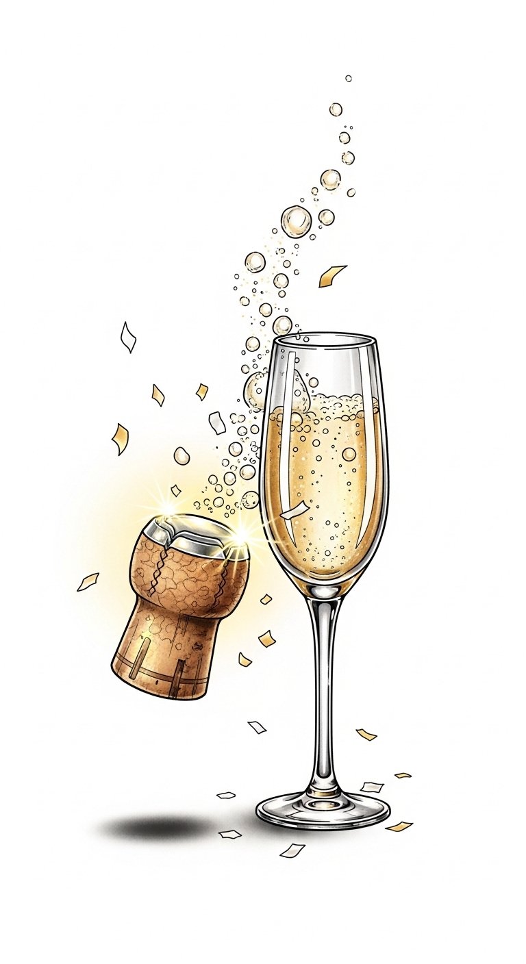 The champagne cork symbolizes spontaneity and triumph, while glass design inspirations can range from elegant flutes to whimsical chalices.