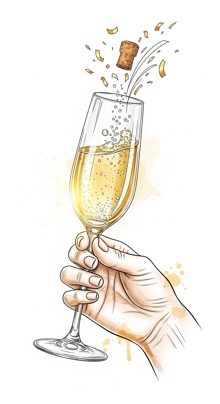 From the lively pop of a champagne cork, the celebration flows seamlessly into the elegant image of a hand holding a champagne glass, a symbol of toasting to life’s milestones.
