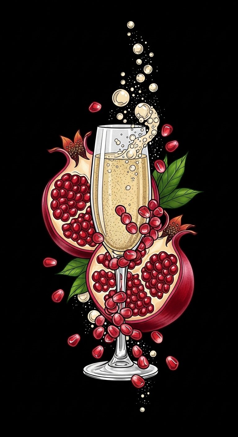Picture this design as a celebratory emblem that blends elegance and warmth: the champagne represents effervescence, lightness, and moments of triumph, while the pomegranate anchors the piece with themes of abundance, fertility, and deep, lasting emotion.