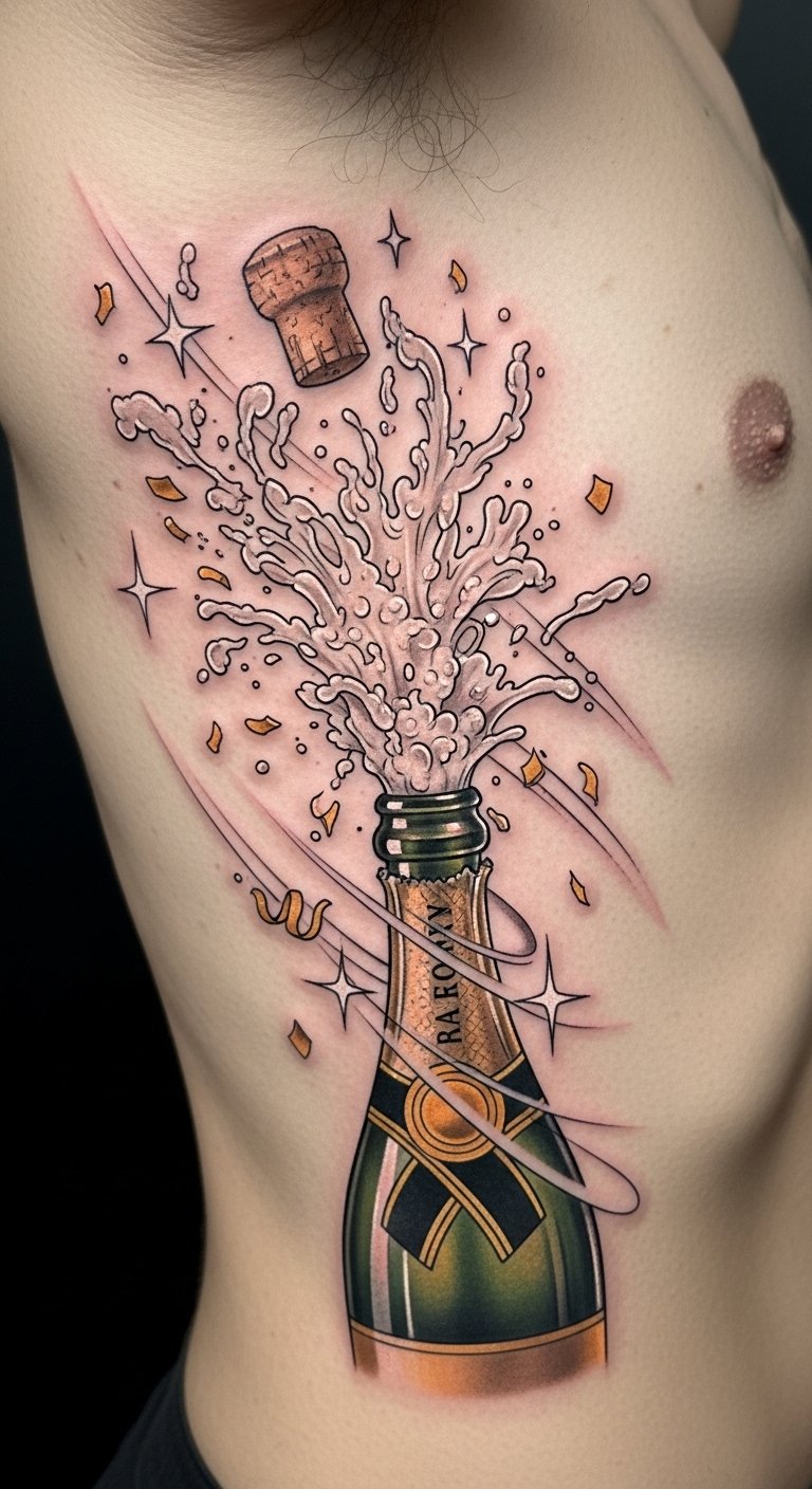 When you want to make a bold statement about celebration and joy, a ribs tattoo of a popped champagne bottle can be the perfect choice. This celebratory design captures the essence of life’s jubilant moments, with bubbly foam spilling over and confetti swirls dancing around it.