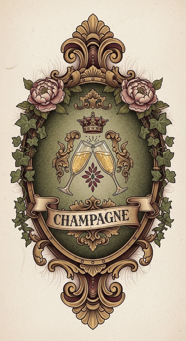 You’ll feel the freedom of expression as you showcase this art, reminding yourself that every occasion deserves a touch of sophistication and joy. This design channels celebration and refinement—bubbles and confetti mark joy and release, the ornate label ties to heritage and memory, and the muted palette keeps it intimate; ideal on the inner forearm or ribcage for personal visibility and emotional resonance.