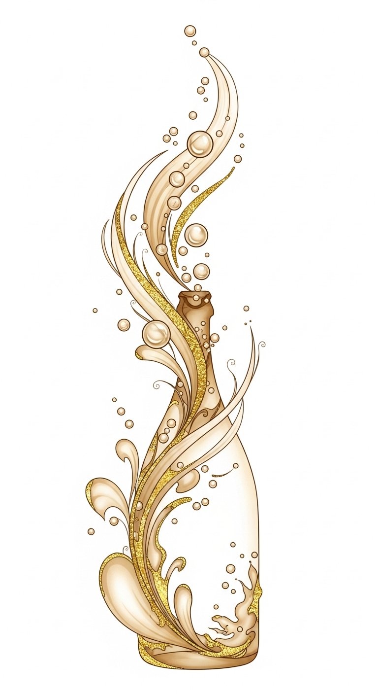 Swirls of gold and effervescent bubbles dance across the skin, embodying joy and freedom; this design symbolizes celebration, transformation, and moments of personal achievement, evoking lightness and festivity.