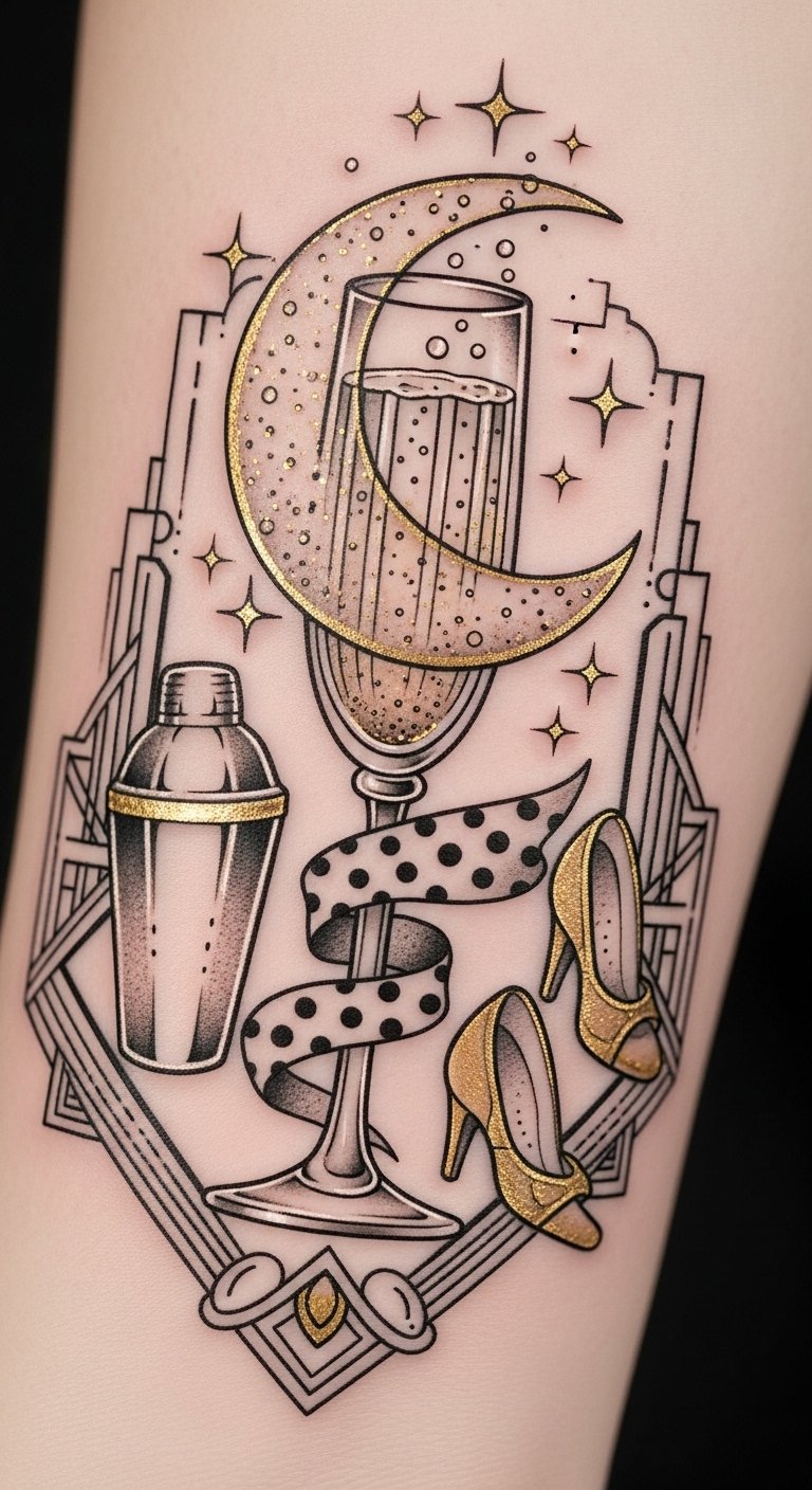 A tattoo that blends celebration and nostalgia: the champagne glass and rising bubbles symbolize joy, effervescence, and fleeting moments worth treasuring; the crescent of bubbles and stars add a dreamy, whimsical feel while the polka dot ribbon and dancing shoes anchor the design in retro playfulness.