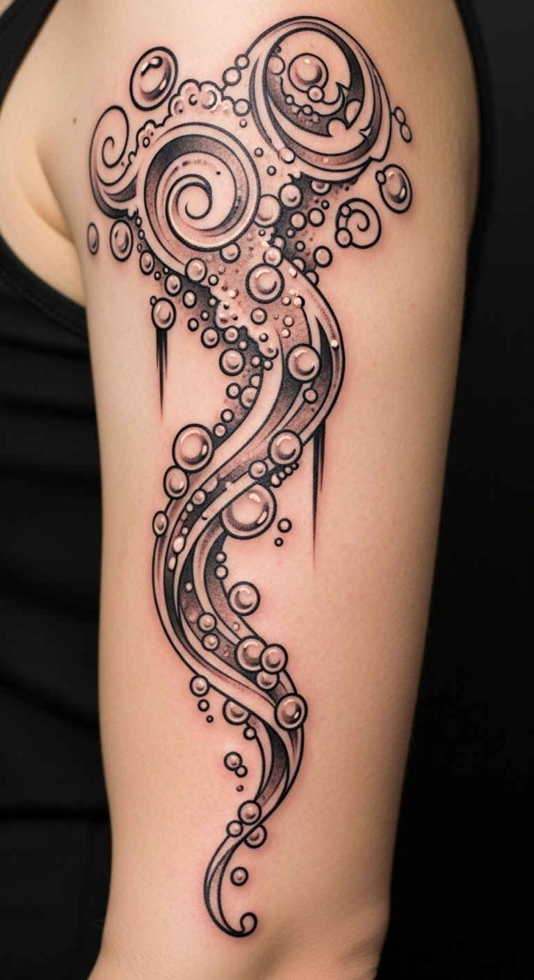 Ideal placements include the forearm, wrapping around the wrist, along the collarbone, or vertically on the ribcage to emphasize the rising motion and let the bubbles and swirls flow naturally with body contours.