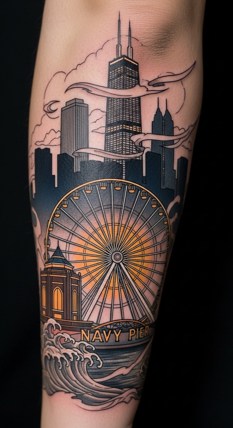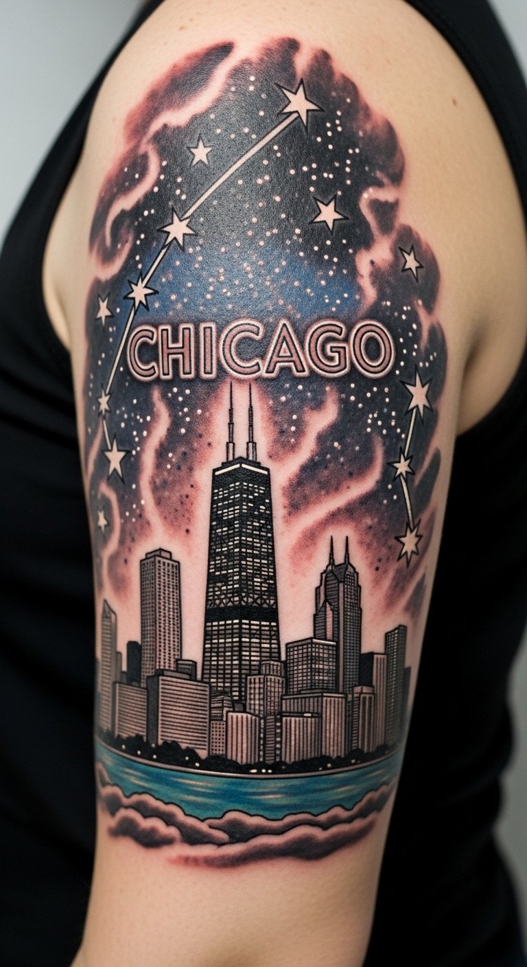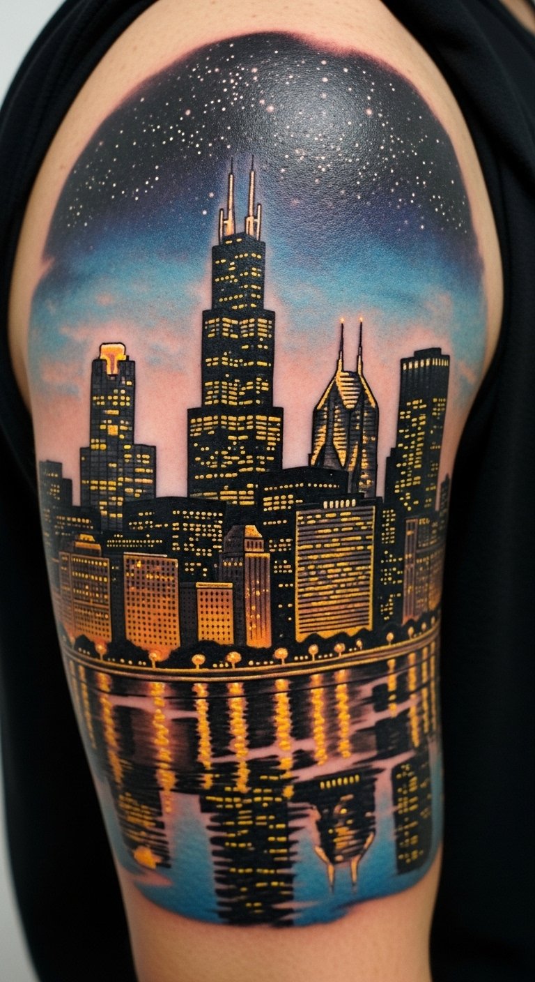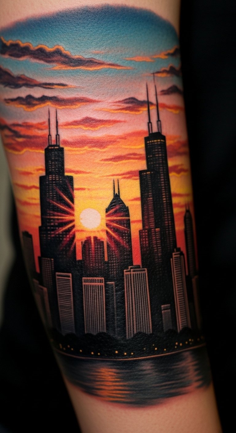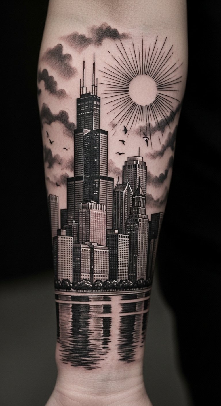Capturing the vibrant spirit of Chicago, a realistic skyline tattoo transforms the city’s iconic architecture into a breathtaking work of art. Each detail reflects the Chicago skyline inspiration, showcasing your love for the city’s energy and history.