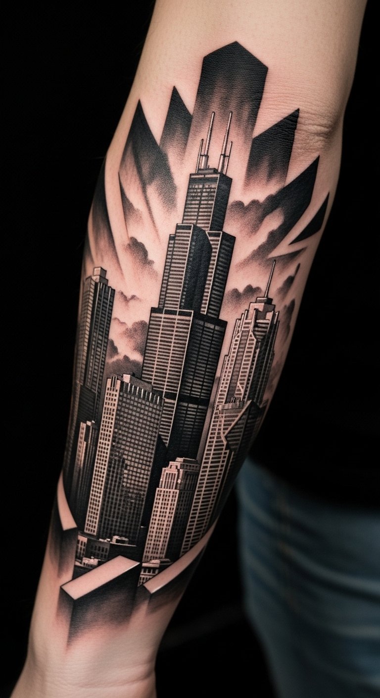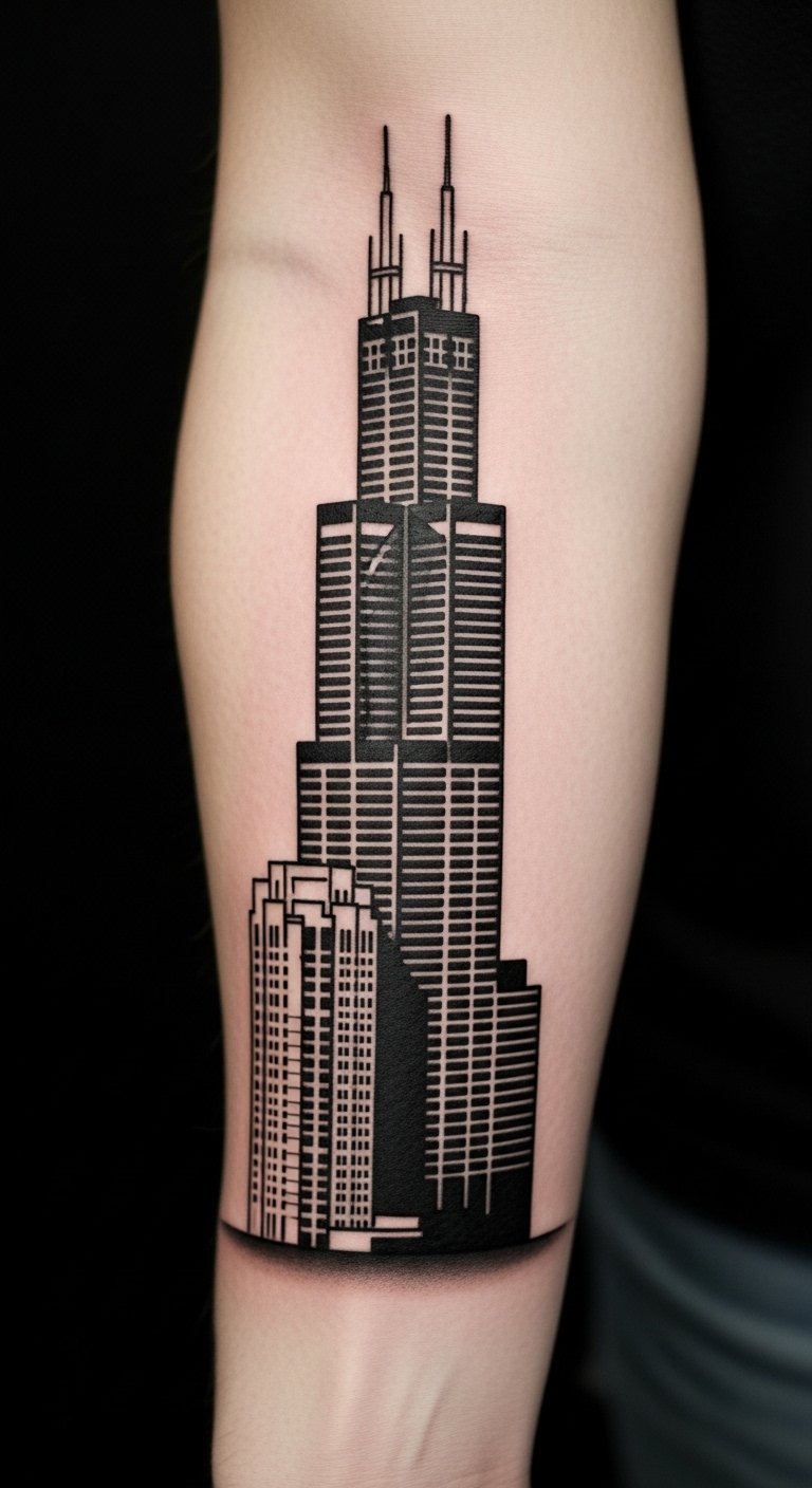 The Willis Tower stands as an iconic symbol of Chicago, and a tattoo design centered around this architectural marvel captures its essence beautifully.