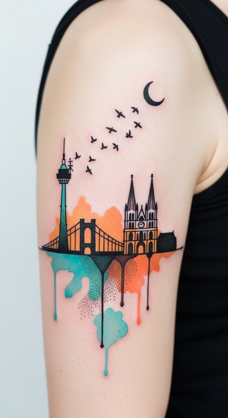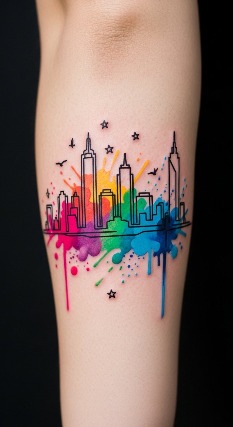 A colorful outline skyline tattoo bursts with life and personality, transforming your skin into a vibrant canvas. With each bold stroke, you embrace artistic expression, showcasing your love for the city. The color contrast brings the skyline alive, reflecting your unique spirit.