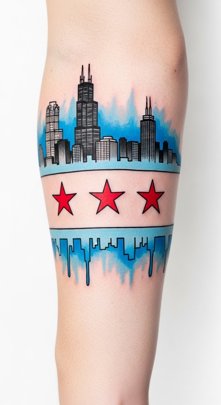 Incorporating the Chicago flag with the skyline in a tattoo design creates a striking tribute to the city’s identity and spirit.