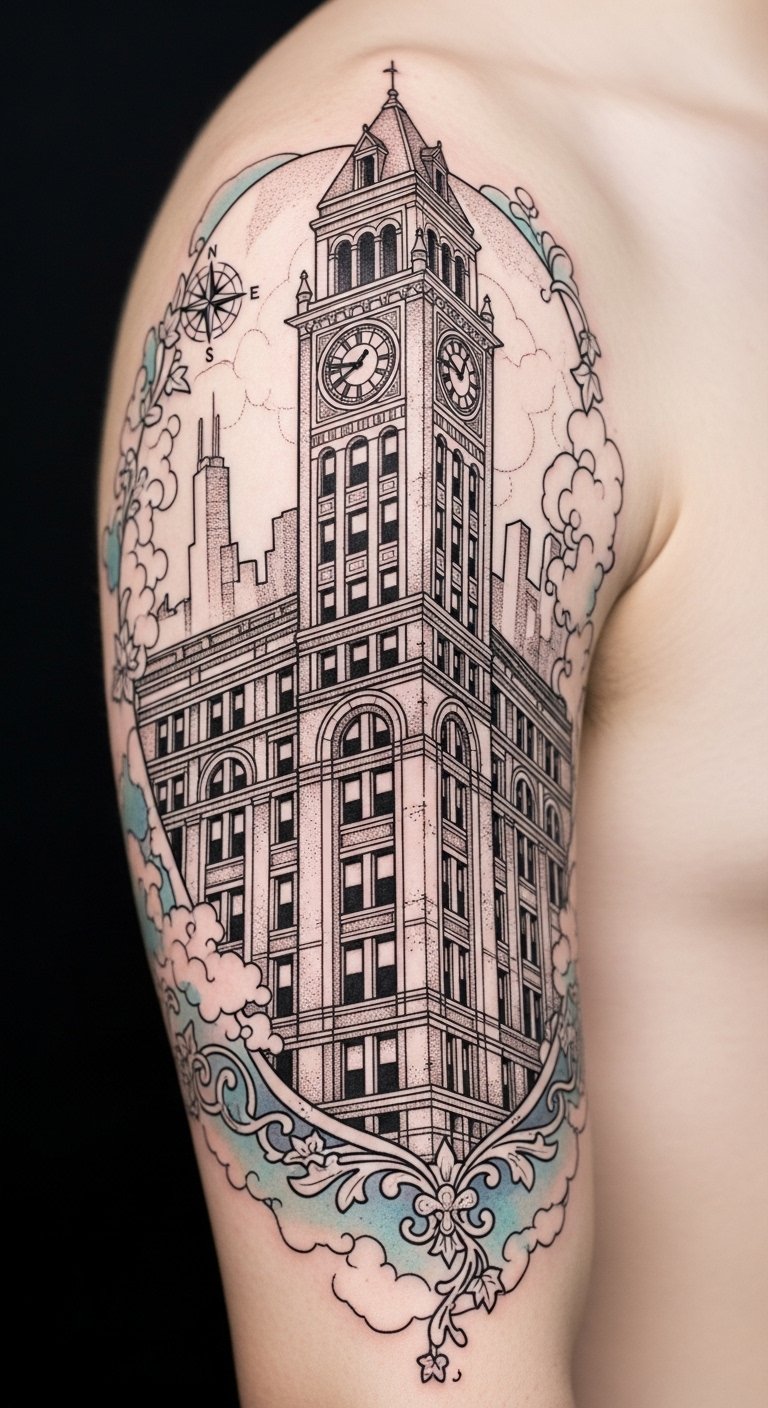 Each inked line evokes nostalgia, inspiring freedom and creativity while celebrating the Wrigley Building’s timeless allure, forever etched on your skin. The design symbolizes a reverence for heritage and personal ties to place, the compass rose and skyline nodding to direction and home; emotionally it balances pride and wistful memory.