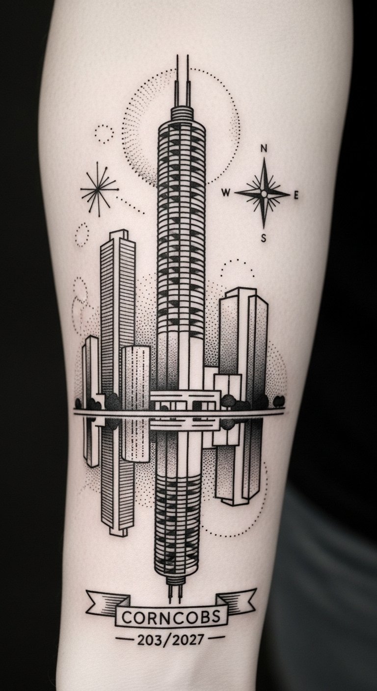 Tattoo artistry thrives on these design elements, infusing personal stories with cultural significance. Your artistic interpretation can transform this skyline representation into a timeless tribute to city landscapes. The design uses the Marina City towers as anchors of memory and identity—clean lines and negative space evoke clarity and resilience, dotwork river reflections suggest fluidity and passage of time, while a small compass and date personalize direction and milestone; emotionally suited for someone rooted in Chicago or who values urban heritage.