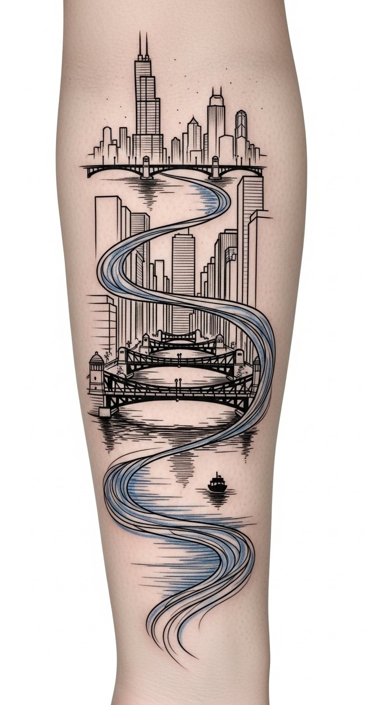 As you capture this essence in ink, let the river’s currents inspire your spirit, embodying the freedom of urban waterways and the pulse of Chicago’s heartbeat. This tattoo concept channels the river as both physical and emotional connector—symbolizing movement, resilience, and personal ties to place—evoking calm energy and urban pride; ideal along the forearm, calf, or side rib where the vertical flow accentuates the body’s natural lines and allows the river’s motion to read clearly.