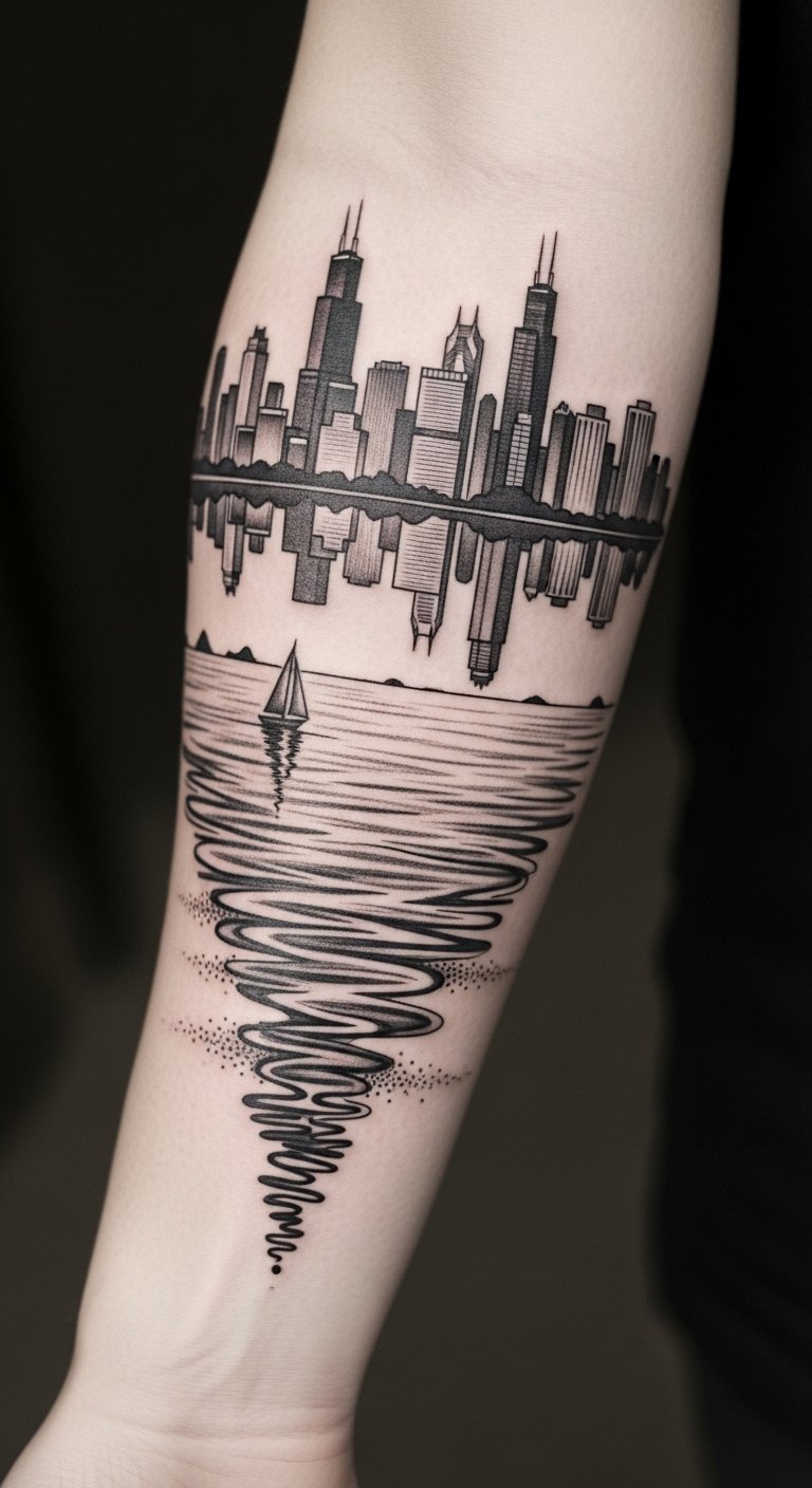 The skyline tattoo significance lies in its ability to embody freedom and resilience, reminding you of the adventures that await beneath those towering structures. This placement along the forearm or side rib allows the composition to elongate with the body’s contours, conveying pride and nostalgia; emotionally it anchors memory and optimism, the contrast and fine detail evoking both grit and elegance while the subtle negative space birds and water reflections suggest movement and future journeys.