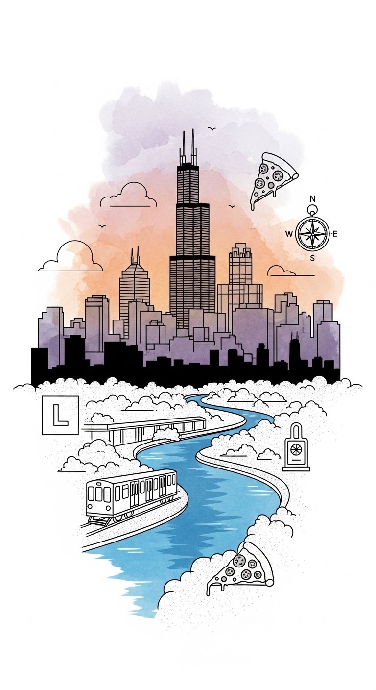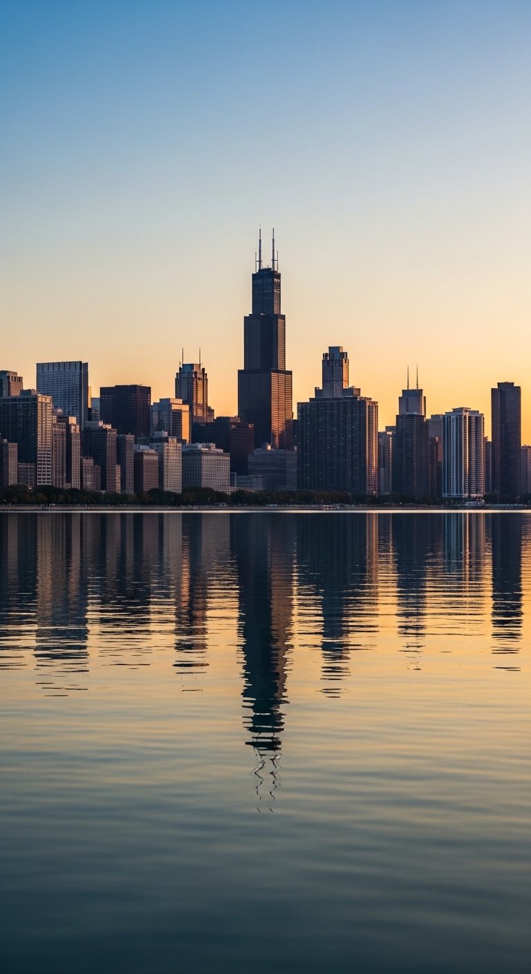 This design blends reflective water textures with crisp architectural silhouettes, using the Lake Michigan surface as a connective canvas that mirrors chosen Chicago landmarks.
