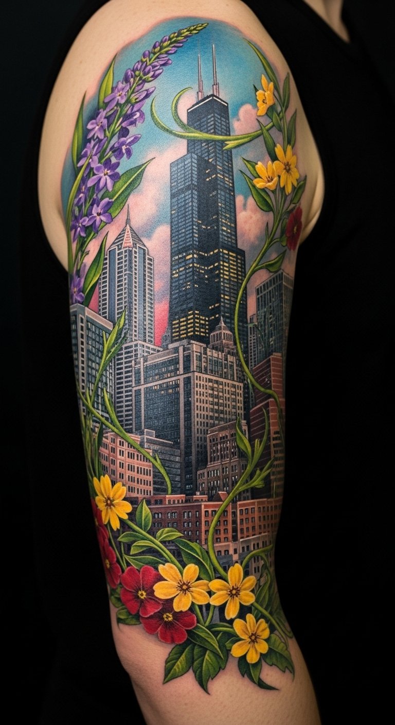When you think of a Chicago skyline tattoo intertwined with local flora, it’s like capturing a love letter to the city itself.