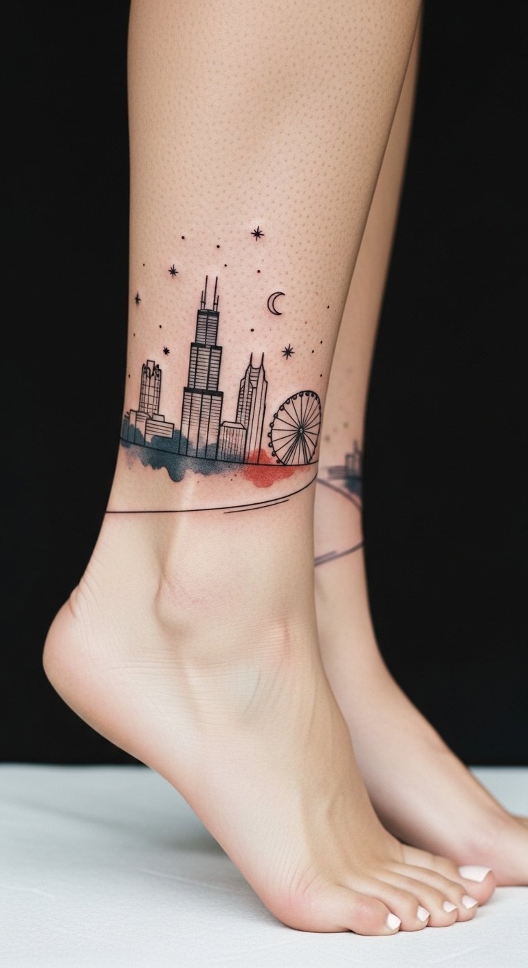 The slim skyline band evokes quiet pride and travel memories, the stars and moon add a nocturnal, wistful mood, and the muted watercolor hints at sunset reflections on the lake; placed along the outer calf and ankle, the piece remains intimate yet visible when desired, moving gently with the body to convey motion and freedom.