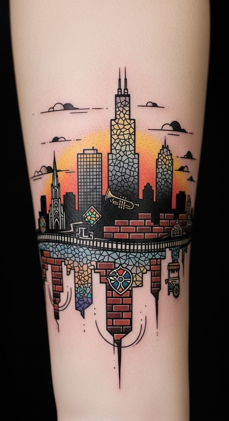 A compact forearm or outer wrist piece that ties together skyline, transit, and neighborhood motifs to symbolize rootedness and shared history; the brick and mosaic textures represent layered heritage, the L tracks signify movement and connection, and the small icons honor cultural touchstones—placed where you see it often to evoke daily pride, resilience, and belonging.