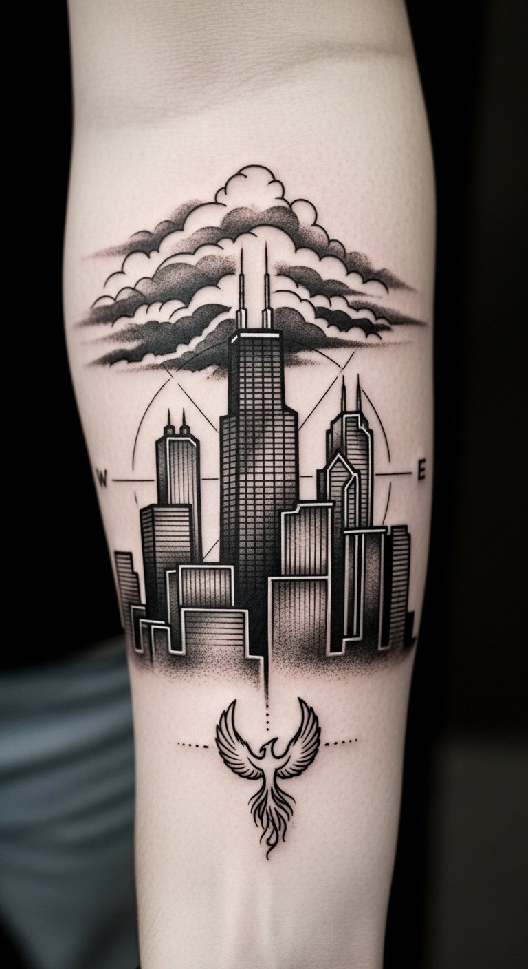 These tattoos celebrate not just a skyline, but the unwavering strength and tenacity of a city that inspires freedom. The phoenix rising from the skyline symbolizes rebirth and personal renewal amid hardship, while the storm-cloud shading evokes overcoming struggle; the compass points suggest guidance and rooted belonging.