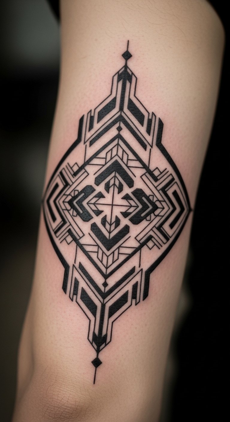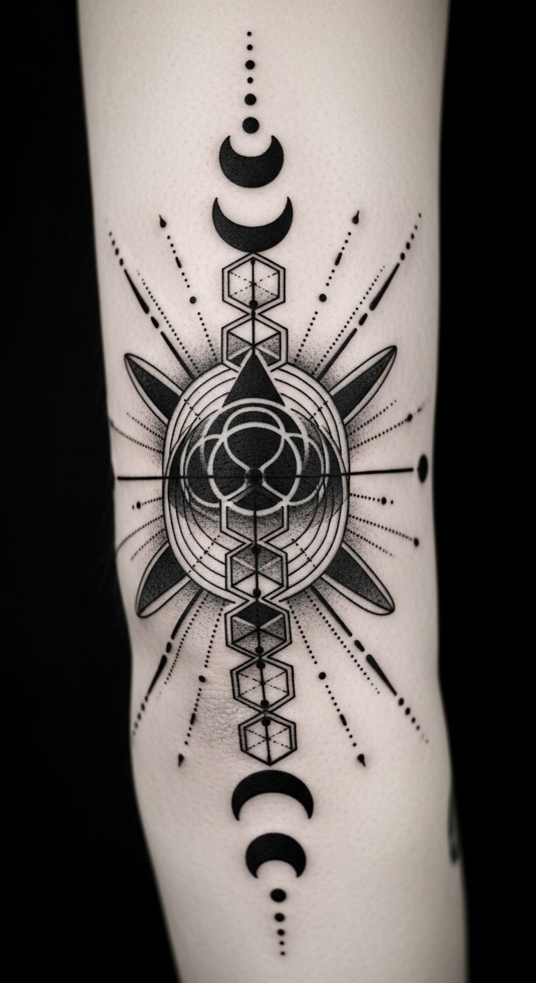 The placement centered on the elbow uses the joint as a focal node where lines converge, creating a sense of protection and resilience; the interplay of bold and fine lines evokes both determination and subtle introspection, while negative space and dotwork offer breathability and a feeling of openness that complements the wearer’s emotional aspiration for balance and liberation.