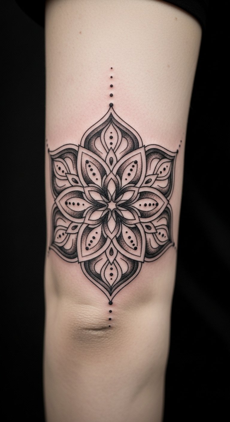 Seven intricate petals symbolize stages of growth, self-discovery, balance, protection, intuition, compassion, and liberation; delicate dotwork and fine line geometry create a luminous, meditative focal point best placed on the outer elbow where the circular form complements joint movement and can be revealed or concealed.