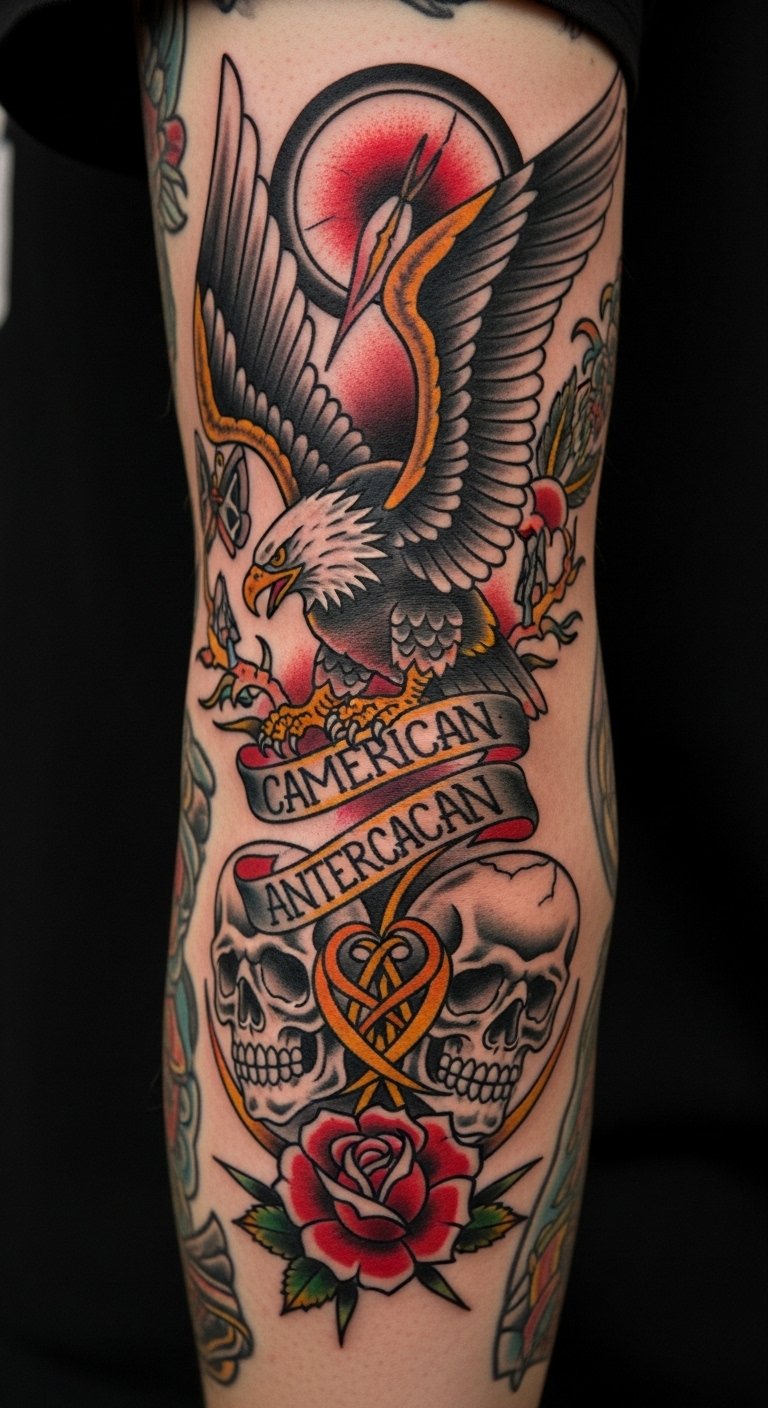 This design centers on an elbow placement where an eagle wings around the joint, skull and rose elements braid through the wing feathers, and bold banners and stars accent the surrounding skin; the symbolism blends freedom (eagle), mortality and resilience (skull), and love or remembrance (roses), evoking nostalgia and defiant optimism.