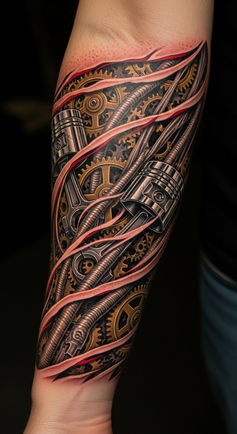 These designs showcase mechanical fusion and organic integration, transforming your skin into a canvas where gears and tendons intertwine. Each tattoo tells a story of strength and freedom, inviting you to embrace the extraordinary and express your unique style.
