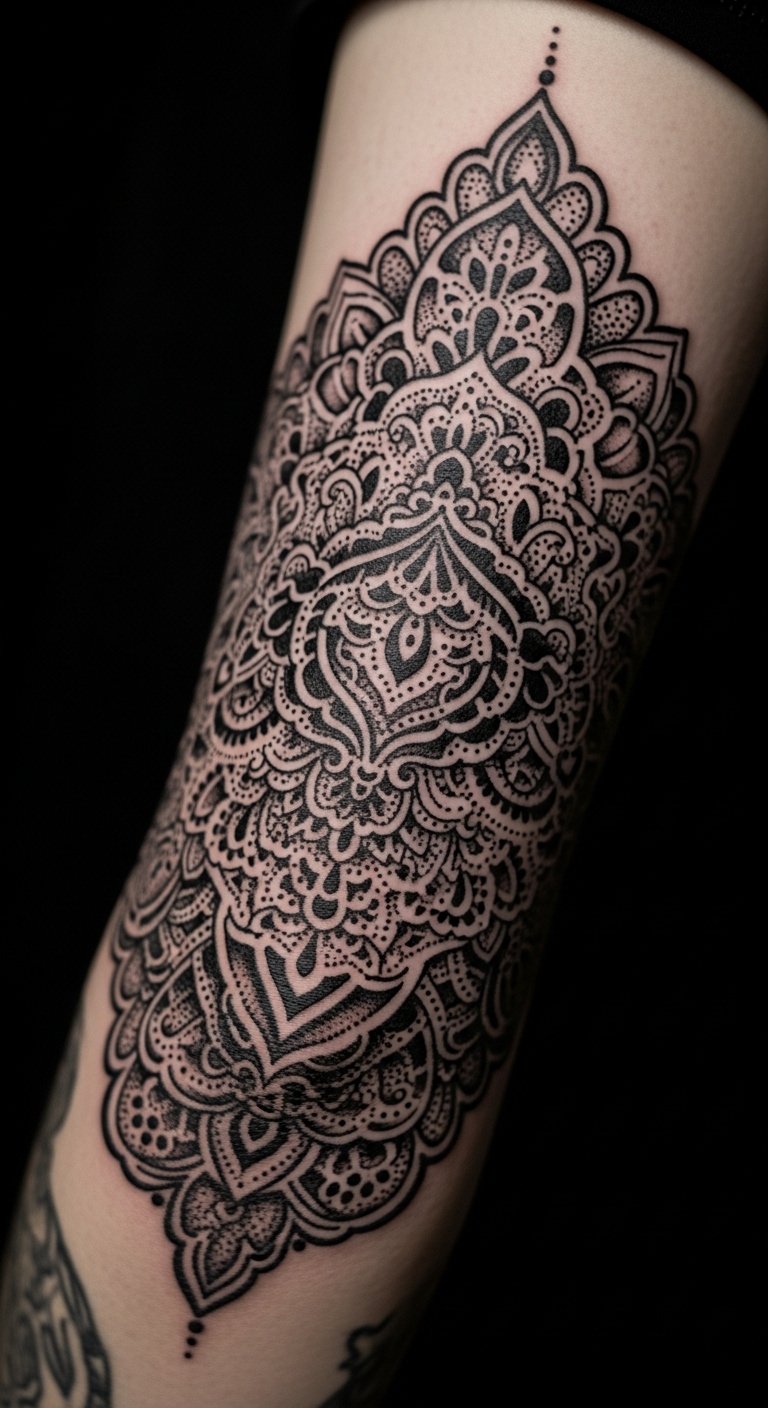 Dotwork tattoos like this piece turn the elbow into a focal point of personal expression, where geometric mandalas and organic filigree meet to symbolize balance, resilience, and the unfolding of self.
