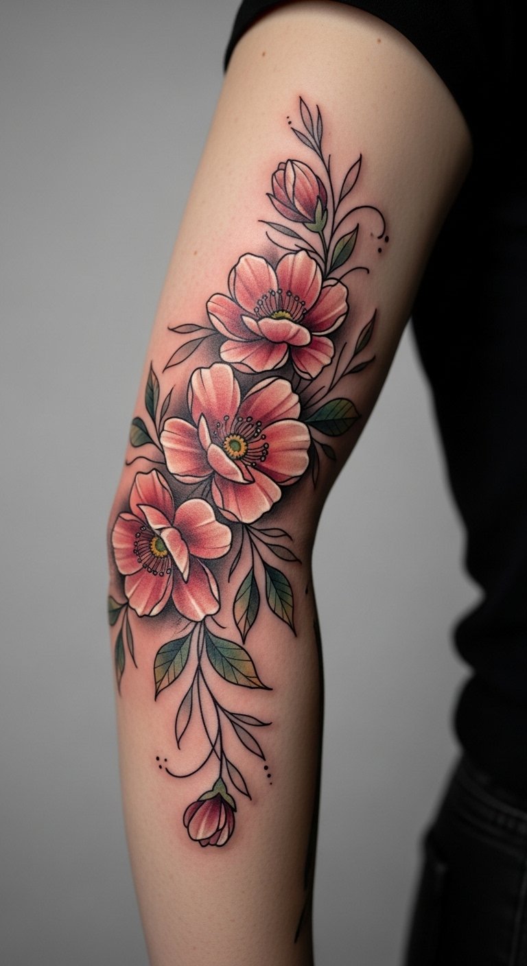 The design evokes renewal and resilience—blossoms signify personal growth and new beginnings while vines represent connection and persistence; placed to curve with the elbow, it moves with the body to animate those meanings.