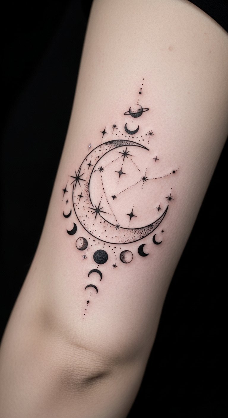 This placement emphasizes motion and cyclical change—lunar phases around the elbow symbolize personal growth and transitions, stars represent guidance and hope, and the delicate linework keeps the design intimate and timeless while complementing the elbow’s natural contours.